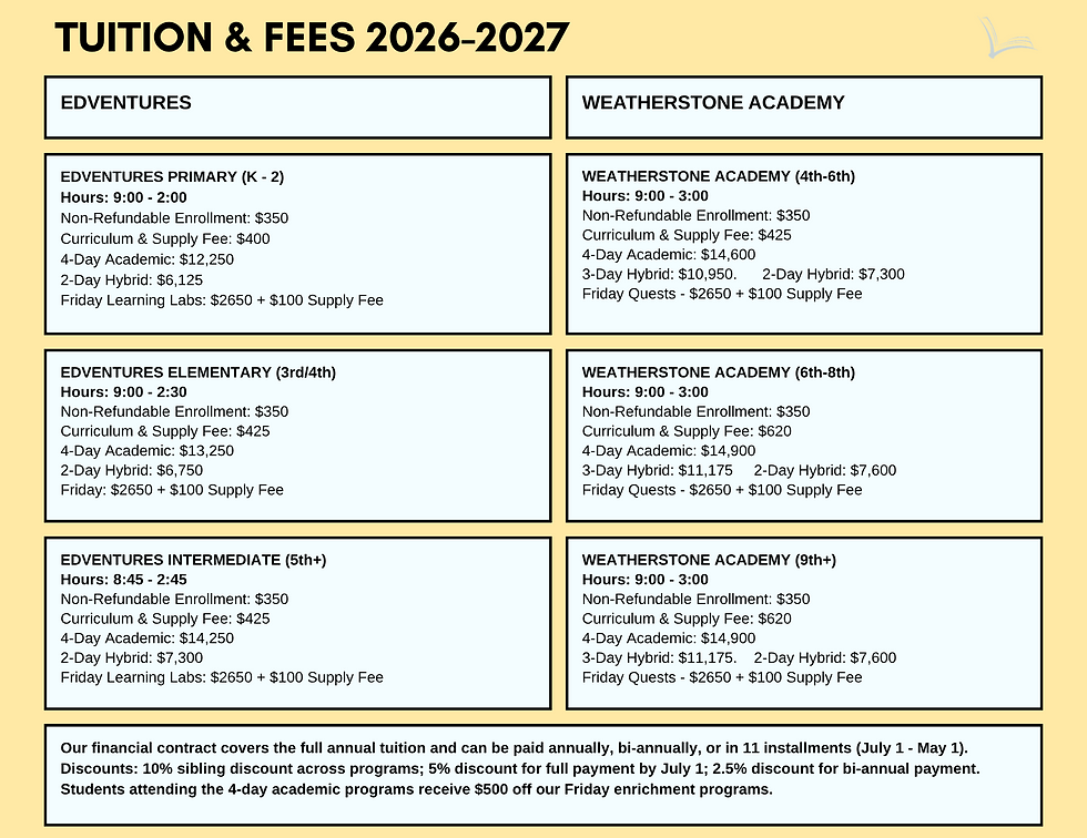10% sibling discount for 2nd and subsequent children in an immediate family enrolled at Weatherstone Academy or EdVentures.